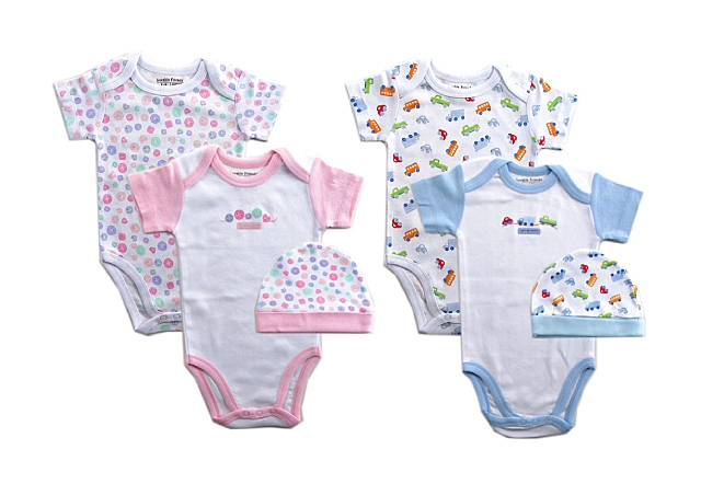 В комплекте два цветных боди с коротким рукавом и шапочка. Боди с двусторонним распахом горловины, приятных пастельных тонов. Трикотажная шапочки с отворотом дополняет комплект. Отлично выглядит в торговом зале, сразу привлекая внимание покупателей.